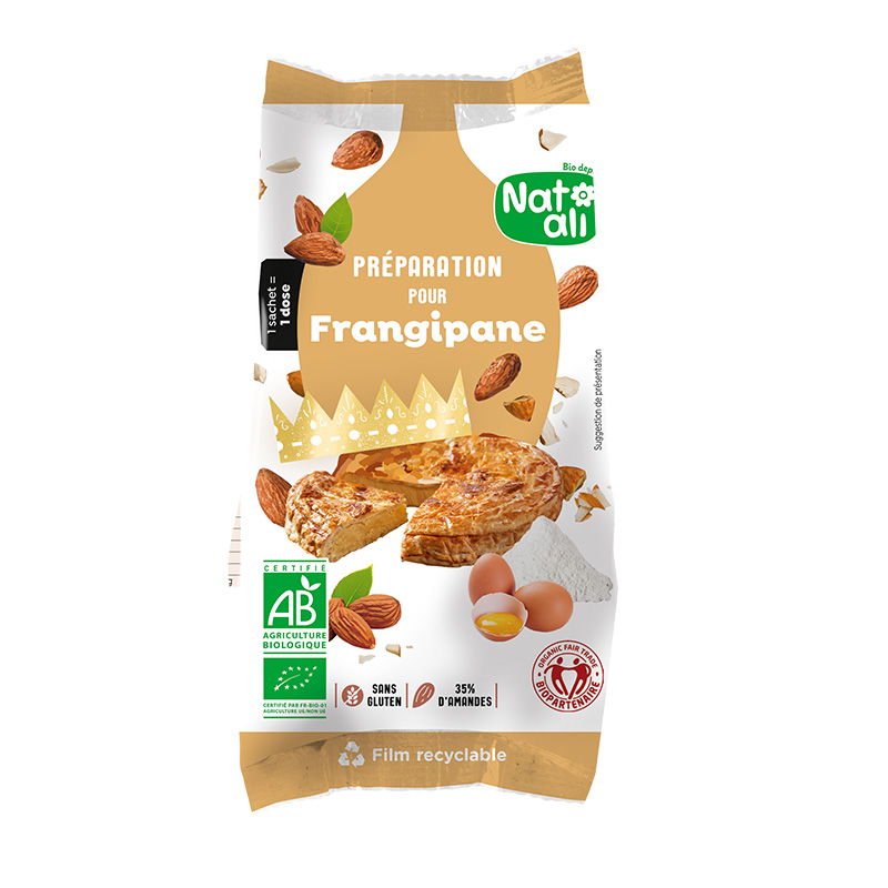 ASTUCE : pour une garniture encore plus onctueuse,mélanger la frangipane avec de la crème pâtissière (préalablement refroidie)réalisée avec un sachet de BIODESSERT Vanille NATALI.