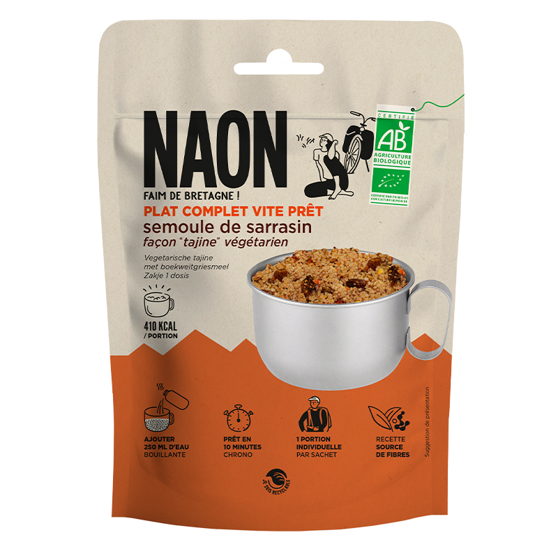 Couscous de sarrasin* (65%), raisins sultanines*#, légumes* (tomate*, carotte*, oignon*), abricots*, brisure de pois chiches*, sel de Guérande, ail*, cumin*,cannelle*, gingembre*, poivre noir*.